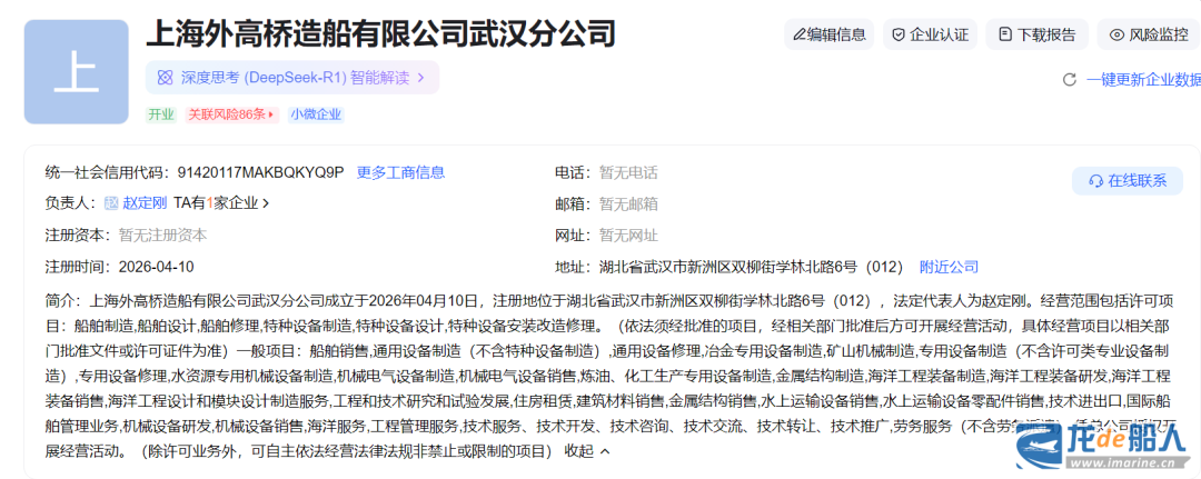 据爱企查数据,上海外高桥造船有限公司武汉分公司成立于2026年4月10日,法定代表人为赵定刚,主营业务包括船舶制造、设计、修理;特种设备制造、设计、安装改造修理;海洋工程装备制造、研发、销售;海洋工程设计和模块设计制造等。