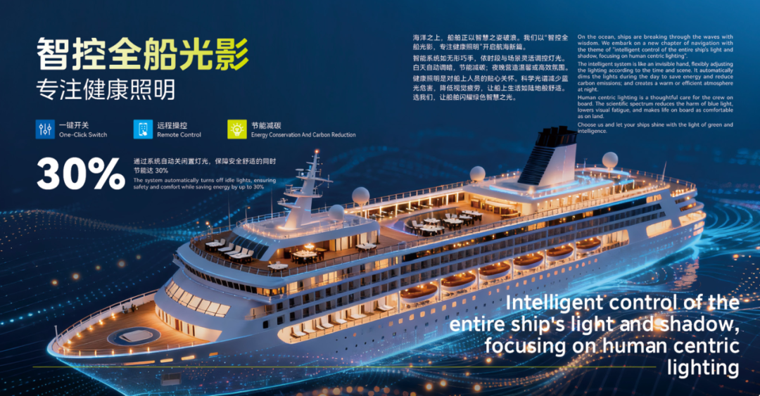以数字总线技术为核心,支持单灯调控、多灯分组、场景一键激活及节律照明适配,能依舰船工况与人员场景营造适配光照,践行 “智能、健康” 理念。操作上,系统配可视化按键面板,场景一键切换,既满足个性化需求,又降低操作门槛,方便船员上手,兼顾便捷与实用。