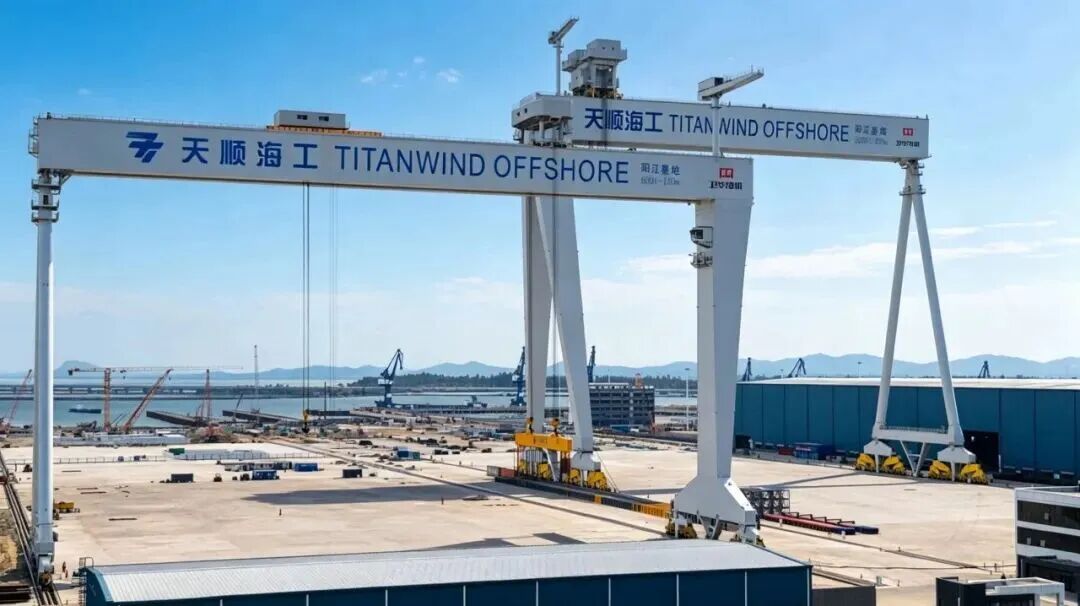 天顺风能阳江基地是天顺风能集团 “陆转海” 战略的关键布局,基地总投资15亿元,占地37万平方米,配备2500吨级龙门吊等顶尖装备及两个专用港池,年生产能力达36万吨。该基地具备海上风电导管架、漂浮式基础、升压站、换流站、海洋牧场及海洋油气装备等高端海工装备的批量化制造能力,形成“制造—总装—出海”全链条高效物流体系,是阳江市建设国际风电城、打造海上风电全产业链的标志性项目,肩负“立足阳江、辐射华南、面向全球”的产业使命,全面助力海洋新能源装备国产化与高端化。