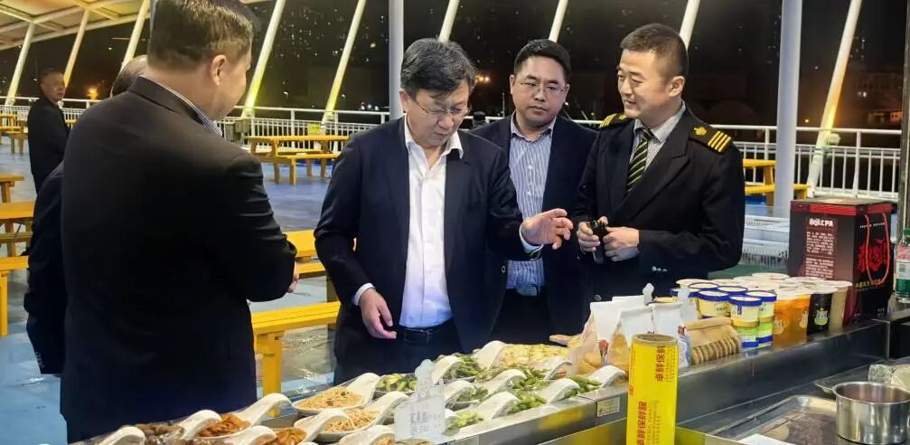 董事长一行前往船舶烧烤甲板,实地查看今年首次启用的海上烧烤项目运营情况,现场品尝特色餐食,并对餐品品质、服务流程提出优化建议,要求进一步提升档次、打造特色,更好满足旅客休闲体验需求。在披萨制作区域,董事长就打造“中华复兴”品牌专属披萨提出建议,强调要坚持现烤现做,以高品质、高颜值餐品吸引旅客、提升服务口碑、树立品牌形象。