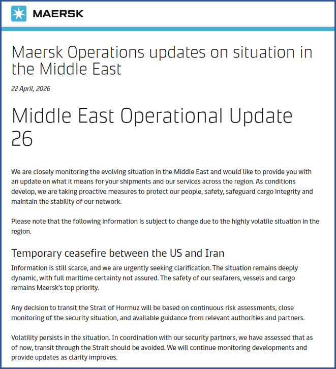 马士基指出,美国和伊朗之间的临时停火,信息仍然稀缺。船员、船舶和客户货物的安全仍然是马士基的首要任务。截至目前,评估认为应避免通过霍尔木兹海峡。马士基将继续监测事态发展,并在清晰度提高时提供最新情况。