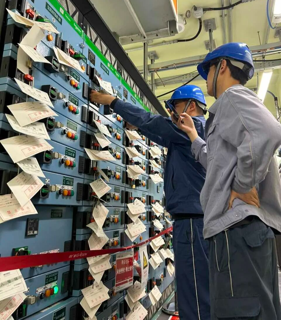 那是一个寻常的夜班。作为一名现场操作员,我正准备进行配电盘的隔离操作。到达现场后,师傅王鑫(左)的目光锐利地扫过操作票和现场设备,“别着急,”他沉着说道:“一步一步来。”我深吸一口气,重新调整状态按照要求,开始了严谨的双人核对。我口述指令,逐一指认设备九字码;师傅则站在我身旁,目光如炬地确认每一个细节。当一切都核实完毕,师傅郑重地举起右手,大声确认:“核实完毕,可以执行!”这不是一句简单的客套,这是一道经过千锤百炼的安全口令。听到这句指令,我毫不犹豫地颔首答允:“执行!”