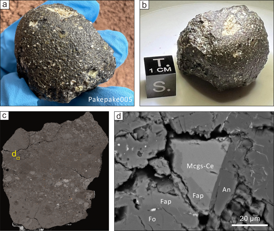 a-b: Pakepake005月球陨石, c-d: 铈镁嫦娥石及其共生矿物