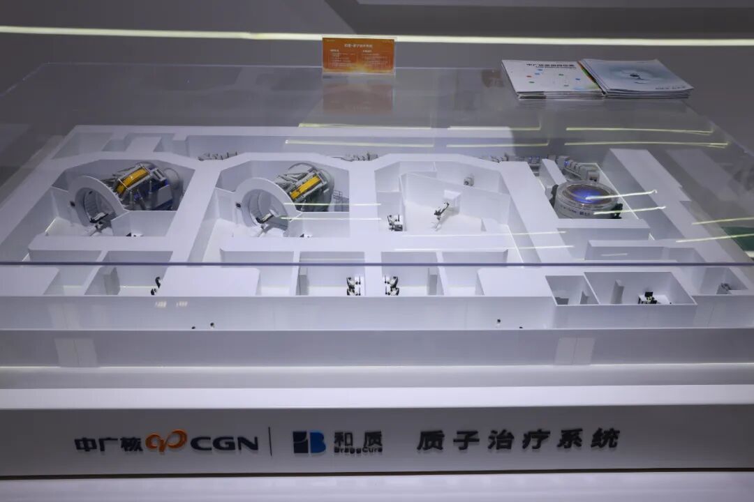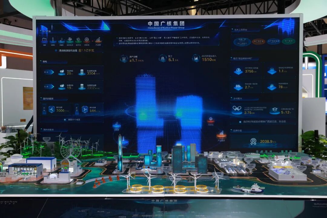展区核心展项“清洁能源一体化解决方案”电子沙盘,用橙、绿、蓝三大场景,生动展现中广核以核电、风电、太阳能赋能活力中国,以质子治疗、医用同位素守护健康中国,以能源安全、安检科技护航安全中国,汇聚绿色动能点亮美丽中国。