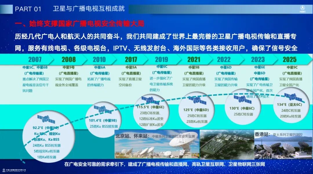 在广电卫星全国产化领域,中国卫通已实现跨越式发展。自“十三五”初期全面启动基于国产东方红四号增强型平台的第二代广电传输和直播卫星升级替代工程以来,“十四五”期间成功发射中星9B、中星6D、中星6E、中星9C等系列国产卫星,实现我国广播电视通信卫星整体资源国产化替代,星上核心元器件实现自主可控,打破了国外技术垄断,筑牢了国家广电安全播出的空间基石。其中,中星9C卫星全面接替引进的中星9号卫星,中星6E卫星成功接替中星6B卫星,与其他在轨国产卫星共同构成“4+2”广电专用卫星体系,卫星载荷能力持续提升,性能、寿命达到同类产品世界先进水平,不仅为广电直播和传输业务提供了稳定可靠的空间支撑,更为4K超高清频道实现全国覆盖提供了支持和保障,助力国家广播电视总局“推动超高清端到端全链条发展”工作落地见效。