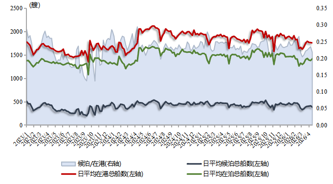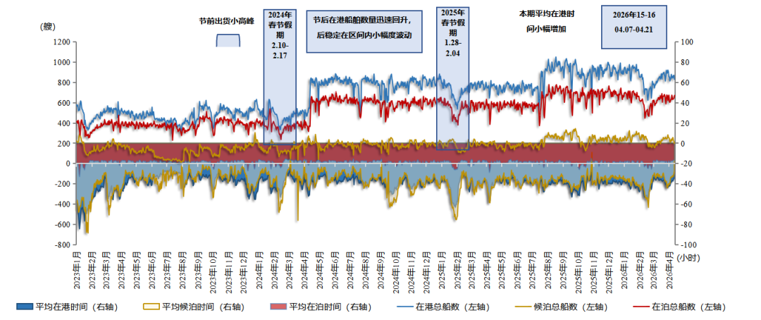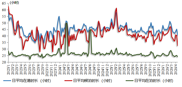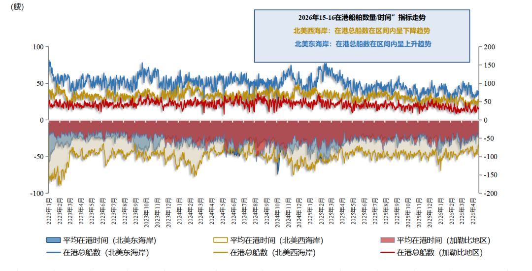 图表1:全球主要集装箱港口日均在港/候泊/在泊船舶数量走势图表2:全球主要集装箱港口船舶日均在港/候泊/在泊时间走势注:因“日平均候泊时长”中直接靠泊的船舶不参与计算,因此图中会出现“日平均候泊时长”大于“日平均在港时长”的情况,特此说明。1、中国大陆港口日均在港/候泊船舶数量下降,日均在港时间小幅延长。2026 年 3 月,中国制造业 PMI 达到50.4%,较 2 月上升1.4 个百分点,制造业景气水平出现明显回升。中东地缘冲突引发全球供应链调整,海外市场阶段性补库存需求有所增加,对我国制造业出口形成一定拉动作用,推动景气度改善。中国大陆主要港口(不含中国台湾、中国香港的共27个港口)的日均在港/候泊/在泊船舶数量较上期环比增速分别-1.9%/-1.8%/-1.3%,日均在港/候泊/在泊时间较上期环比增速分别2.0%/-0.1%/-1.8%。本期中国港口集装箱运行数据的特征是“量降时涨”,风暴、大风等极端天气导致的临时管制是拉长在港时间的首要推手。而中东局势的余波和关税政策的博弈则构成复杂的干扰项。图表3:2023年1月1日-2026年4月21日中国大陆港口船舶在港时间表现走势2、北美日均候泊船舶数量大幅减少,日均在泊时间呈上升趋势。