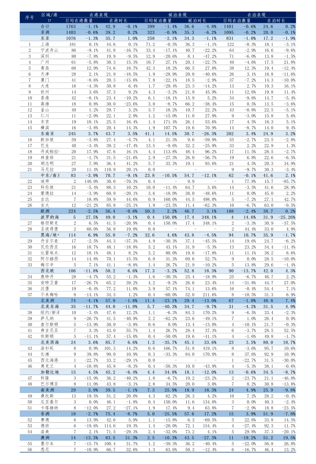 【在港船舶数量分析】根据图表1可见,本期全球主要集装箱港口日均在港/候泊/在泊的船舶数量分别为1763 /399 /1401艘,分别较上期环比增速-1.1%/ -1.4% /-0.6%,日均在港/候泊/在泊的船舶数量均呈下降趋势。【在港船舶时间效率分析】根据图表2可见,本期全球主要集装箱港口平均在港/候泊/在泊时间分别为42.9/36.6 /24.6小时,分别较上期环比增速-0.1%/-4.8% /0.2%,平均在港/候泊时间呈下降趋势。
