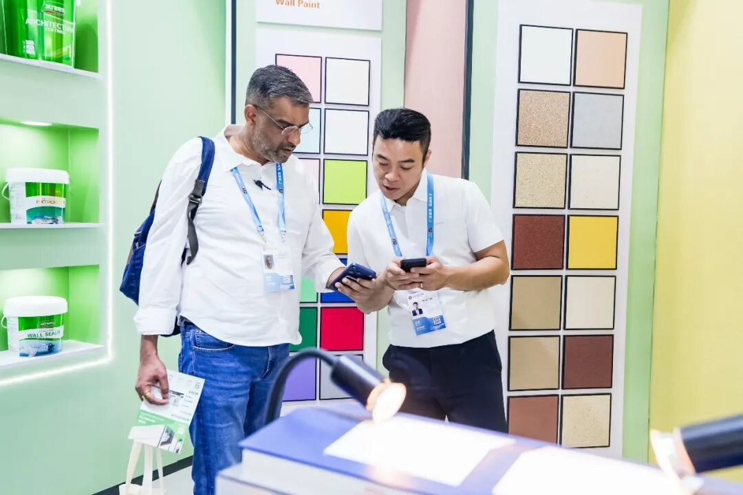 展会当日,广州大雨如注,却未能阻挡全球客商的参会热情。三棵树展位依然吸引了来自全球各地的采购商与行业伙伴纷至沓来,展区内人头攒动,交流洽谈气氛热烈。现场设置的实景展示区让观众可亲手触摸、近距离感受产品质感,充分展示三棵树在健康涂料领域的技术积淀与产品优势。现场咨询量与意向签约量均创下新高,为三棵树进一步拓展国际市场奠定了坚实基础。