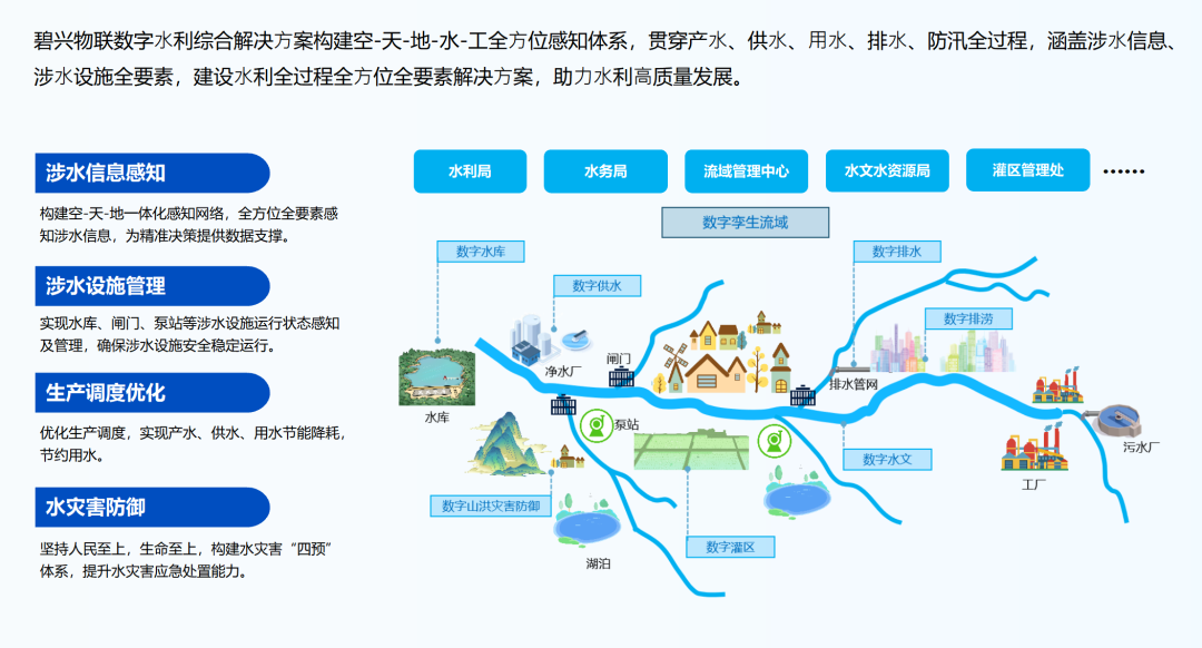 碧兴物联以 “感知 - 传输 - 分析 - 决策 - 调度”为核心,打造数字水利与城市水务两大核心解决方案,实现全场景、全要素、全流程智能管控。