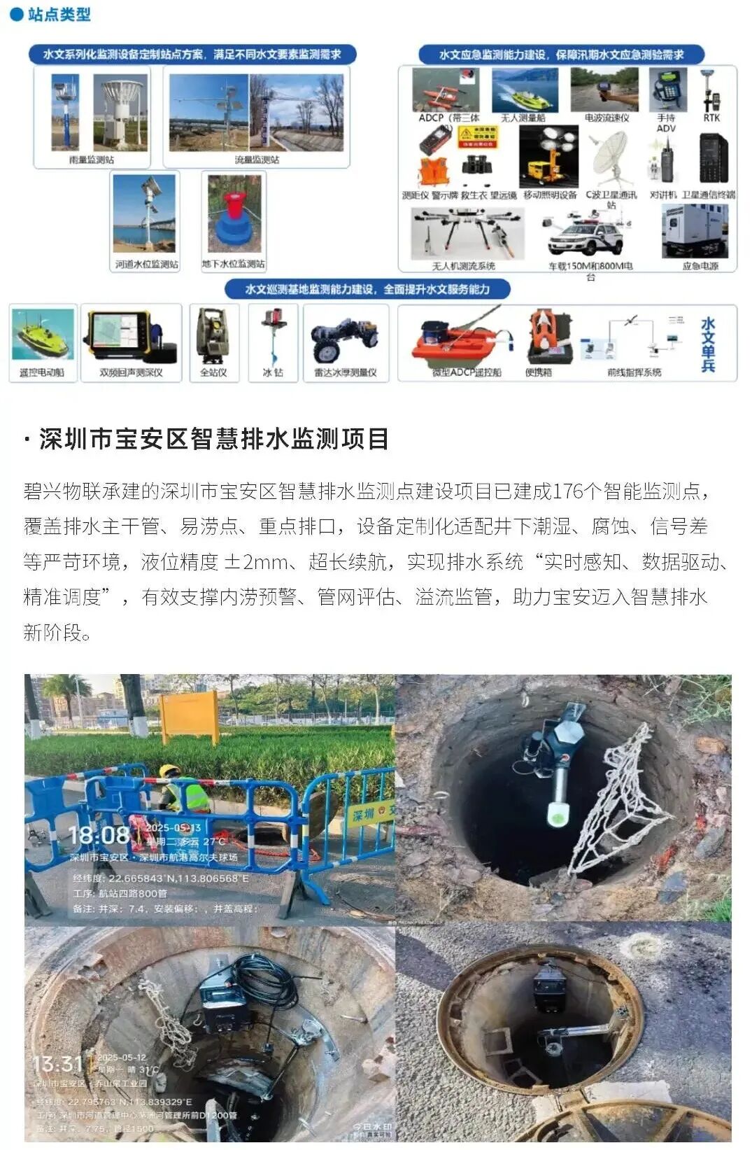 水文水利监测类(雷达流量计、阵列式雷达流量计、ADCP、走航式流速剖面仪、翻斗式雨量计、小型无人船等),可广泛应用于河道、管网、水库、排水系统、再生水厂等场景,全面支撑智慧水务与数字孪生水利建设。