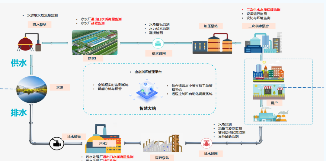 覆盖 “水源地 — 净水厂 — 供水管网 — 二次供水 — 用户 — 排水管网 — 污水处理厂 — 入河排口”全链条,整合供水保障、管网漏损、排水防涝、污水处理、水环境监管等功能,通过智能监测终端 + 智慧平台 + 移动 APP,实现从人工经验管控到数据驱动智能决策的转型,全面提升城市供水安全、排水韧性与水环境治理水平。