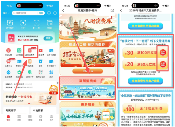 线下通用券:4月15日至5月5日每日9时,市民游客可通过云闪付App参与抢券。活动设有“满100减30”和“满50减20”两档优惠,适用于福州参与活动的景区、特色餐饮、文创商店、小剧场等线下文旅商户。