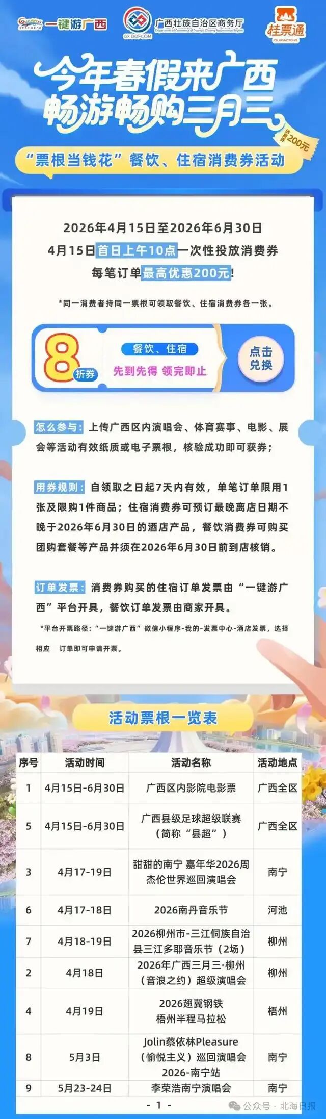 票根当钱花,吃住折上折:将于4月15日至6月30日期间,围绕春假出游、节庆欢聚、文体娱消费热潮,推出5万份“票根当钱花”餐饮住宿专属消费券福利,让区内外游客在观演观赛中,尽享多重消费实惠叠加。