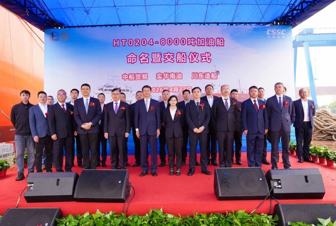 4月22日上午,实华南油订造的8000吨供油兼油品运输船“朝阳903”轮在江苏靖江举行命名暨交船仪式。重庆装备/川东造船党委书记、董事长徐猛,中船澄西副总经理姜道如,中石化燃料油业务和市场部处长余羽华,招商南油总轮机长奚玉生出席仪式并致辞。