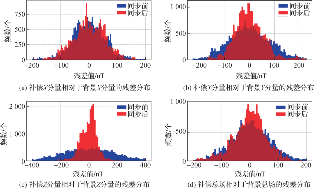 图7 “O”形校准环同步前、后磁场补偿结果相对于背景场的三分量及总场残差直方图