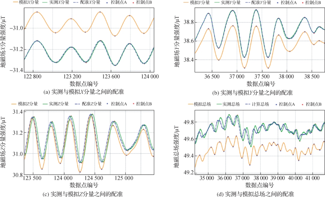 定量分析不同航向实测三分量与模拟三分量之间的失配情况,发现因时延差体现在波动相位上时与波动周期有关,故这种失配误差并非是个常量,不能通过整体的波形移位实现数据配准。为了可靠解算磁补偿参数,配准“8”字形、“O”形校准环数据,采取如图6所示的波形匹配方式:⑴以模拟三分量为基准,选择其波峰波谷点作为控制点;⑵相对应地,伸缩实测三分量波形,实现两者之间的配准。实际可选择一些明显对应的波峰波谷点,甚至一阶导数波峰波谷点,逐段进行伸缩匹配。
