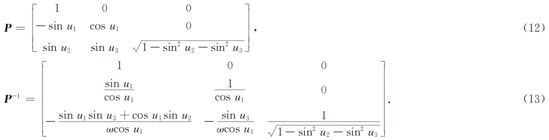 其中,非正交性矩阵(P)由三轴偏角u1、u2和u3表示: