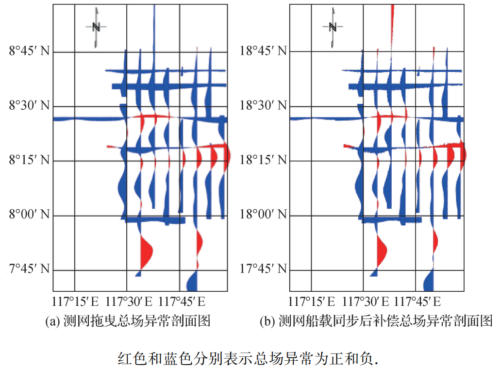 图9 测网拖曳总场异常(a)和同步后补偿总场异常(b)剖面图