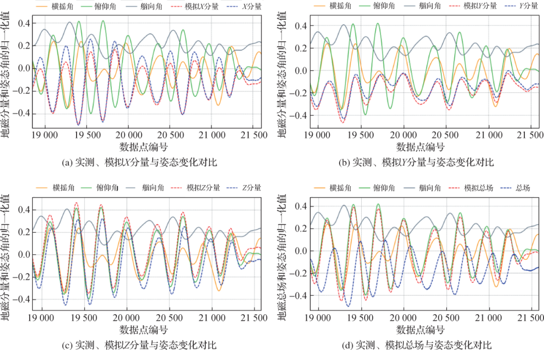 图5 归一化后实测、模拟地磁三分量及总场与姿态变化对比