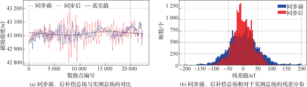 图8 “O”形校准环同步前、后磁场补偿总场相对于实测地磁总场的对比(a)及残差直方图(b)