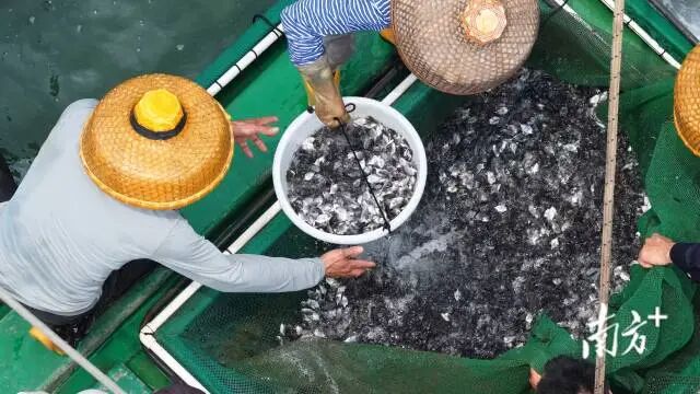 ▲ 渔民捞起金鲳鱼苗,投放到深水网箱。