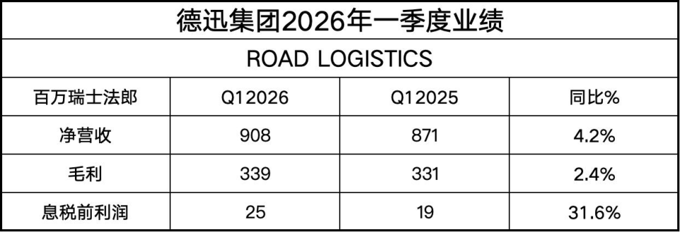 2026年一季度,德迅公路物流业务部门实现9.1亿瑞士法郎的净营业额,同比增长4.2%;EBIT为2500万瑞士法郎,同比增长31.6%。