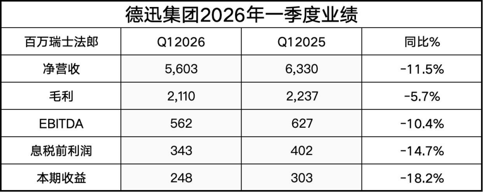 具体而言,2026年一季度,德迅集团实现净营业收入56.0亿瑞士法郎,同比减少11.5%;毛利达到21.1亿瑞士法郎,同比减少5.7%;息税前利润(EBIT)为3.4亿瑞士法郎,同比减少14.7%;净利润为2.5亿瑞士法郎,同比减少18.2%。2026年一季度转换率(EBIT与毛利的比)达到16.3%。