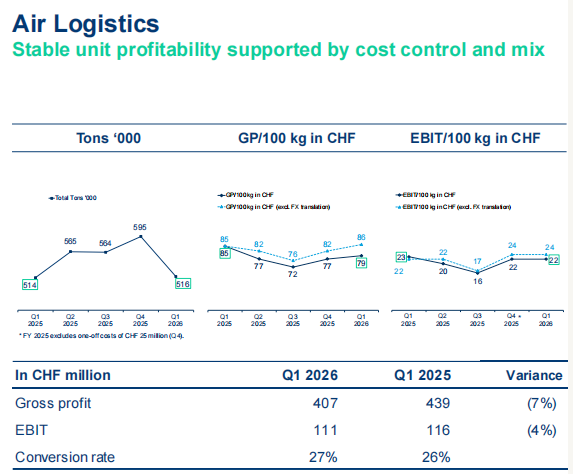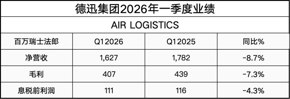 2026年一季度,德迅空运物流业务实现16.3亿瑞士法郎的净营业额,同比减少8.7%;EBIT为1.1亿瑞士法郎,同比减少4.3%。转化率达到27.3%。