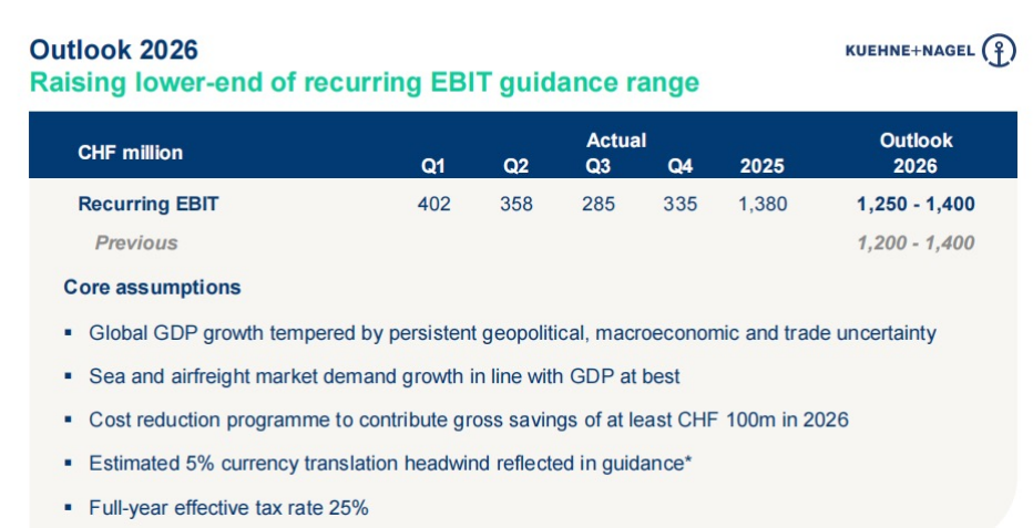考虑到一季度的业绩,德迅集团预计2026年全年EBIT将在12.5亿至14亿瑞士法郎之间。