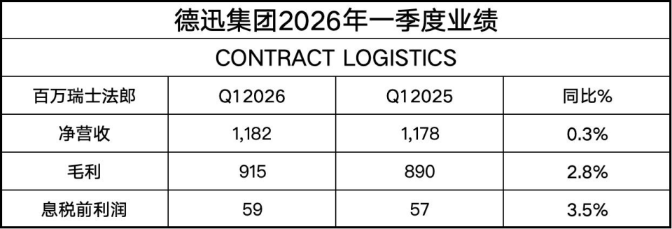 德迅合同物流业务在2026年一季度实现11.8亿瑞士法郎的净营业额,同比增长0.3%;EBIT达到5900万瑞士法郎,同比增长3.5%。