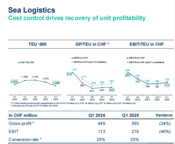 2026年一季度,德迅海运物流业务实现净营业额18.9亿瑞士法郎,同比减少24.5%;EBIT达到1.1亿瑞士法郎,同比减少46.2%。转化率继续维持在25.2%。