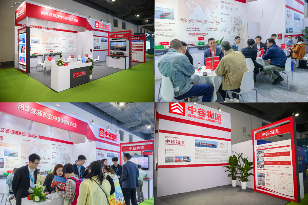 中谷物流展台位于展馆一层1-T075,展台以“中谷红”为主色调,采用开放式布局。展区精心设置了企业形象区、服务展示区、会议洽谈区三大板块,全面呈现了中谷物流在外贸航线、内外贸一体化布局及“公、铁、水”多式联运领域的实践成果。