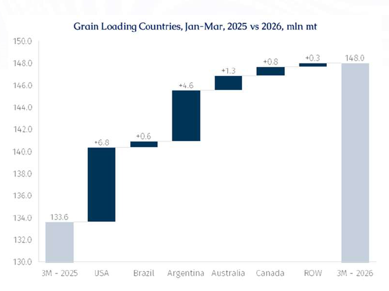 如果要解释为什么Panamax会在这一轮市场中显得格外强,一个绕不开的关键词就是:粮食。BRS在近期的一份周报中,对2026年第一季度全球海运粮食贸易做了系统梳理。报告显示,2026年1月至3月,全球海运粮食装载量同比增长10.8%,从1.336亿吨升至1.48亿吨,整体恢复力度不弱。主要出口国中,美国、阿根廷、澳大利亚、俄罗斯和法国的出口都有较明显增长,前十大出口国整体增幅达到12.2%。但更关键的,不只是总量恢复,而是这些增量是如何分配到各个船型上的。根据BRS整理的数据,同样是粮食贸易回暖,受益最大的并不是所有船型平均受益。Kamsarmax运输量同比增加8.2%,Panamax增加3.1%,Ultramax增加47.8%,而Handysize和Handymax则明显回落。也就是说,这一轮粮食贸易恢复,并没有简单转化为全船型普涨,而是更多集中在适配主要粮食航线和港口条件的几个中型船板块上。这也是为什么市场会出现一种看上去“有点不按常理出牌”的局面:总需求在回升,但真正被运价放大的,是特定航线、特定船型和特定区域之间的匹配关系。换句话说,这一轮不是全面行情,而是结构行情。绕航带来的吨海里放大,改变了市场的受益顺序