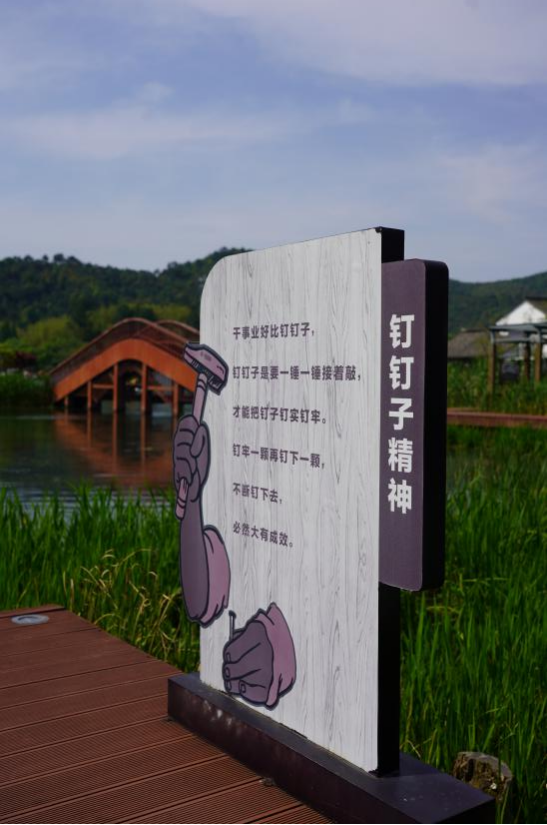 “钉钉子精神”“草帽精神”“蒲公英精神”“长征精神”……园区里的红色主题景观前,大家驻足凝视、轻声交流,从红色精神中汲取做好宣传工作的韧劲与担当。