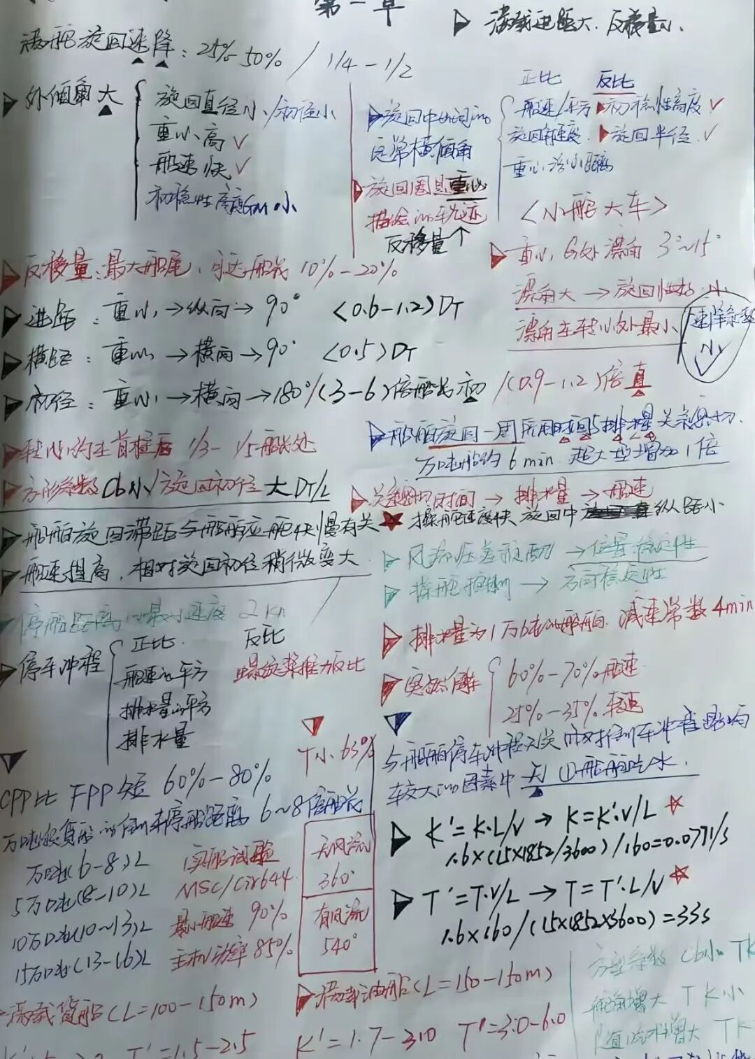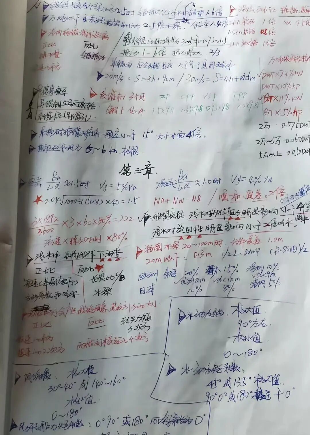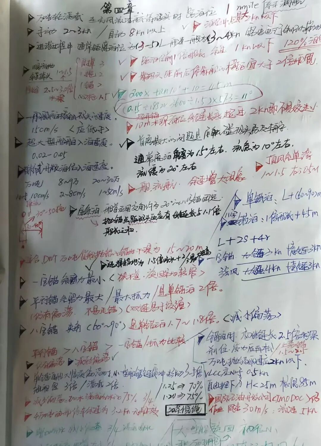 我记笔记习惯用“三色笔+手绘”。黑笔抄录核心知识点与规程,红笔专用于圈出关键数据、易错点和安全红线,蓝笔则记录老师傅们口口相传的实战窍门。遇到船舶受力、靠泊角度等复杂情况,随手画出示意图,让抽象概念一目了然。所有容易出错或需要特别注意的地方,我都会用符号反复标注,并画上红五星重点提醒。笔记本里没有一句空话,每一页都是能直接指导作业的“干货”和“硬货”。