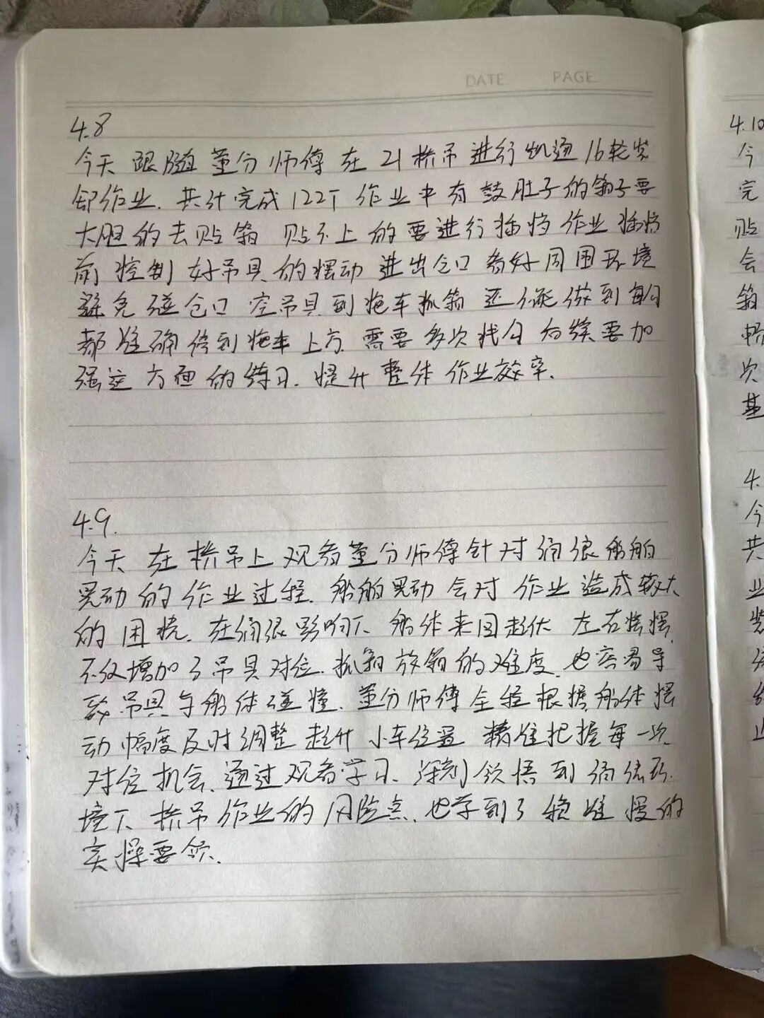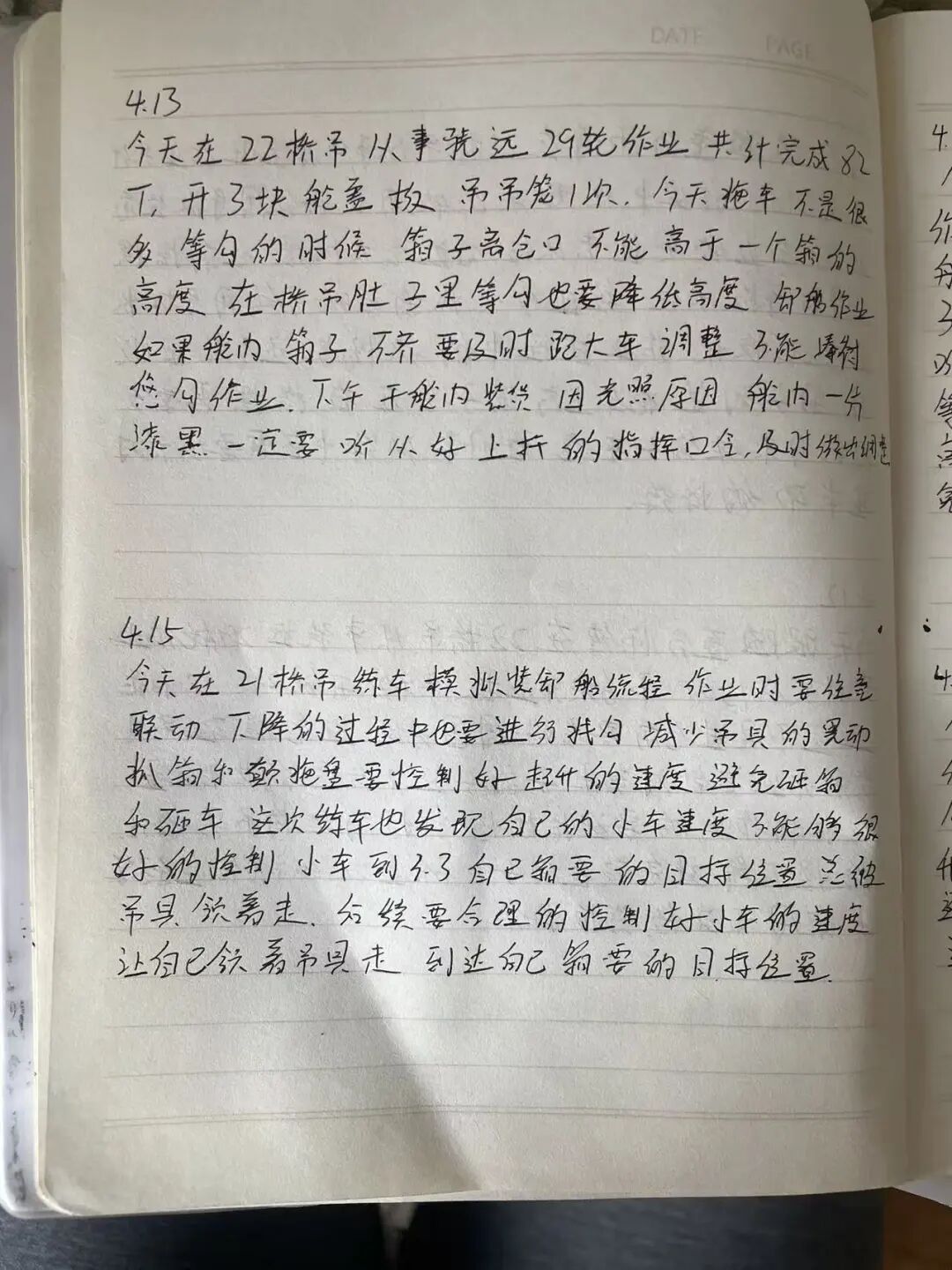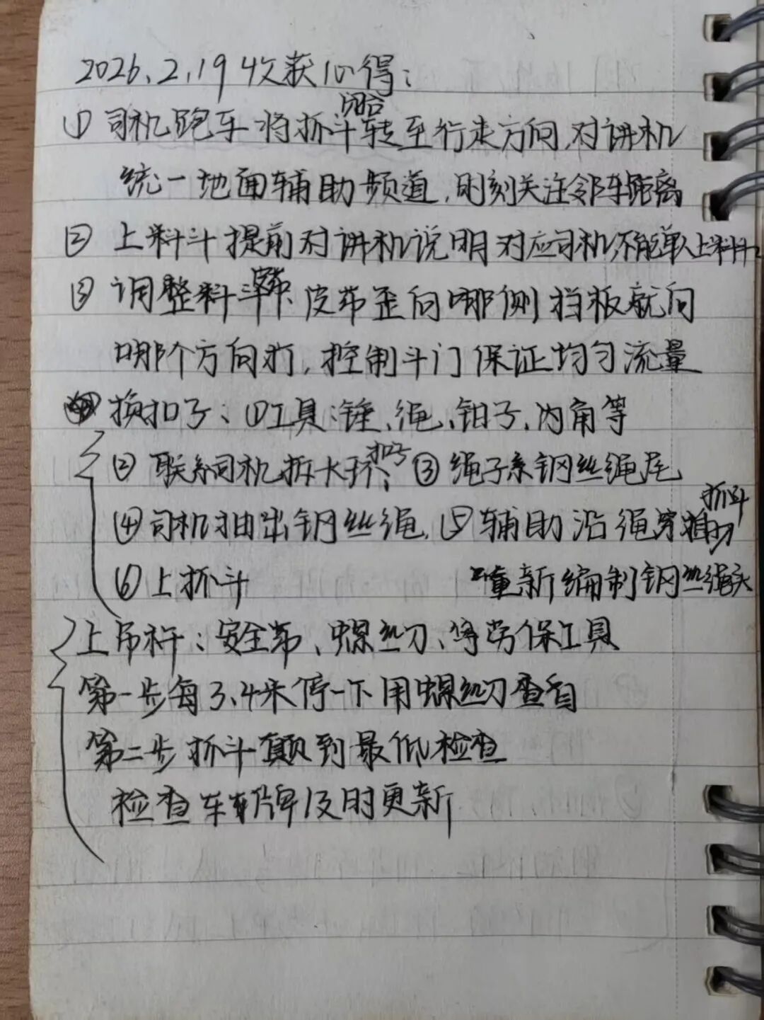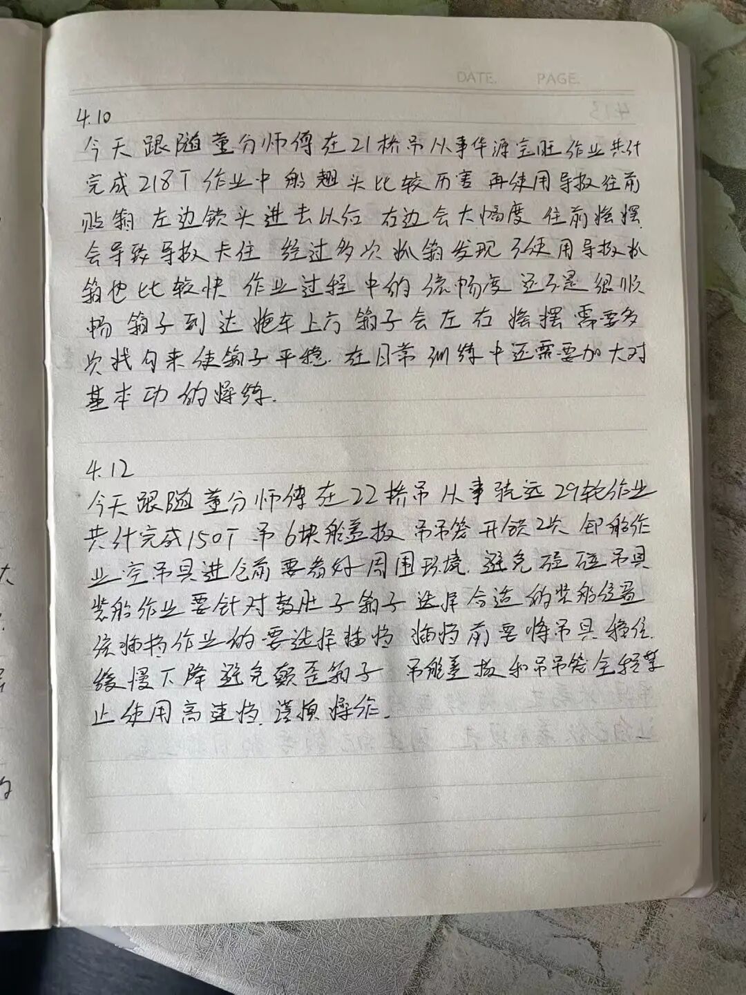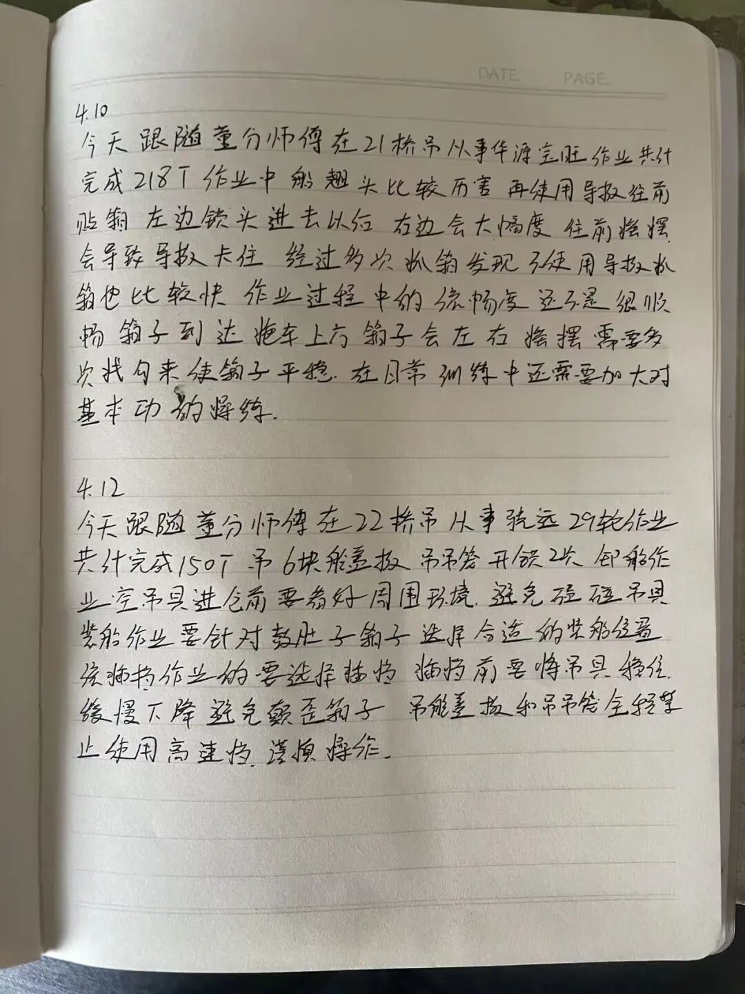 每天跟班结束后,我会趁热打铁记下当天的核心收获。技巧是“三记三对比”:记师父的操作节奏、记异常处置的临场反应、记自己卡顿的瞬间;对比师父与自己的手法差异、对比不同工况下的稳钩策略、对比当天的进步与不足。