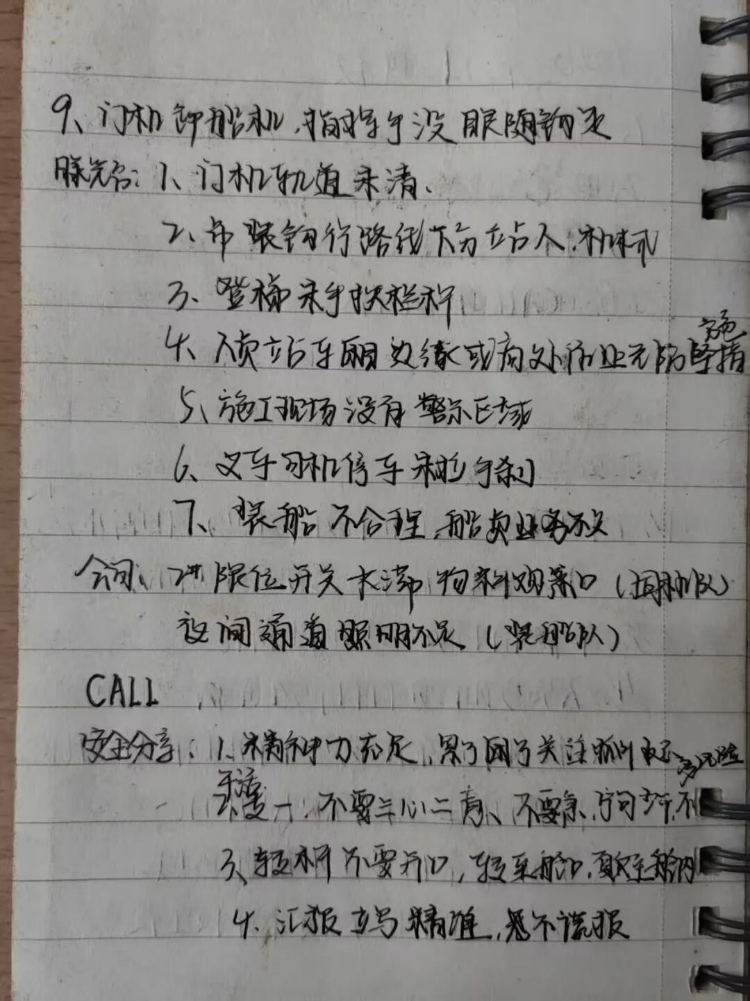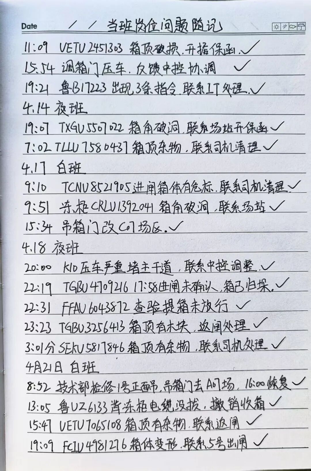 我根据自身岗位特点,把需要记录的内容分为五个板块,分别是:闸口业务风险、重点业务流程心得、安全事故案例、配工会内容、当班岗位问题随记。遇到需要记录的内容时,就会根据内容归类到相应的板块里。在当班岗位问题随记页,每处理完一条问题,都会在后面打个对钩,这样下班时,就不会带着问题回家。