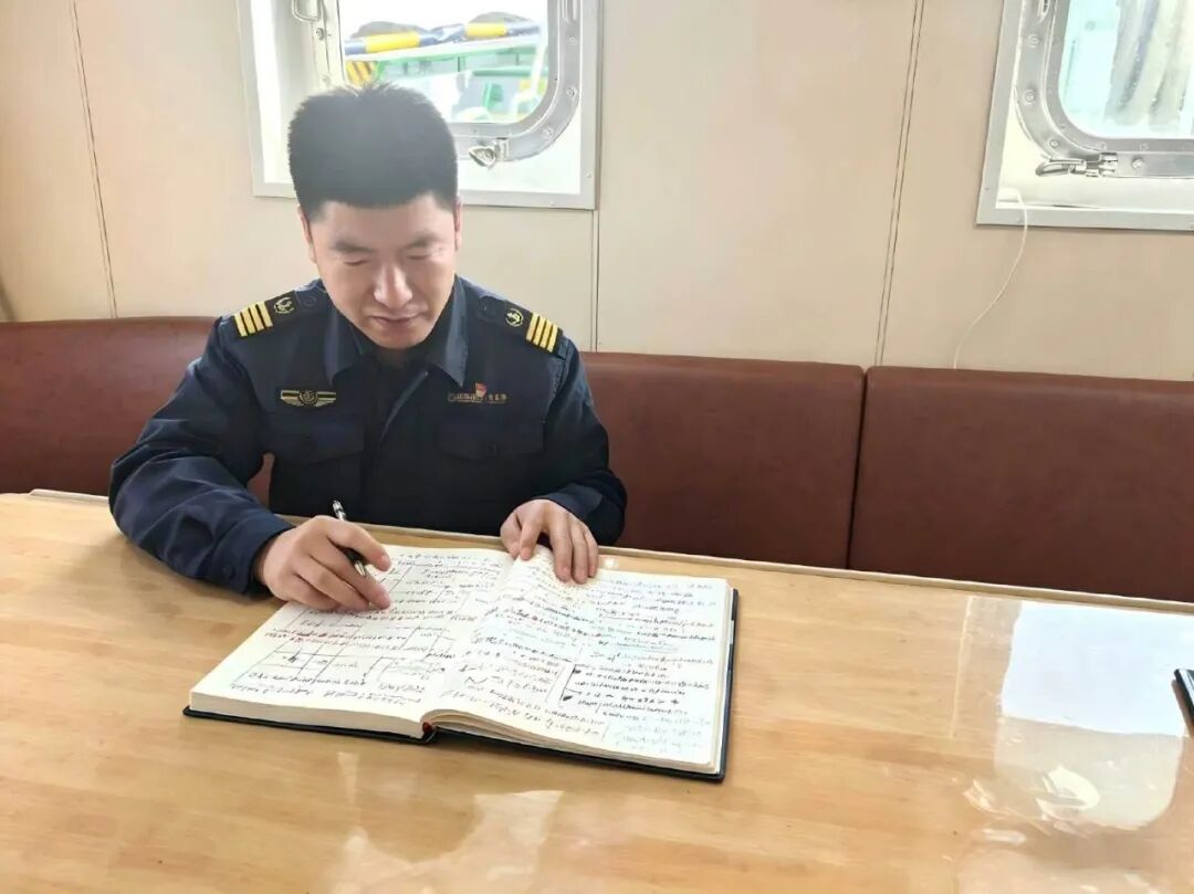 这本写满字迹、红黑蓝交错的本子,是我最重要的“海上工具书”。船舶作业讲究精准,不同吨位的船舶所需拖力、各种海况下的安全余量、特定泊位的风流影响……这些保障安全与效率的关键信息,都浓缩在笔记里。把它放在驾驶台触手可及的地方,一有空闲便反复翻阅、加深记忆。如今它成为了带教新同事的“入门指南”,让宝贵的经验得以传承。