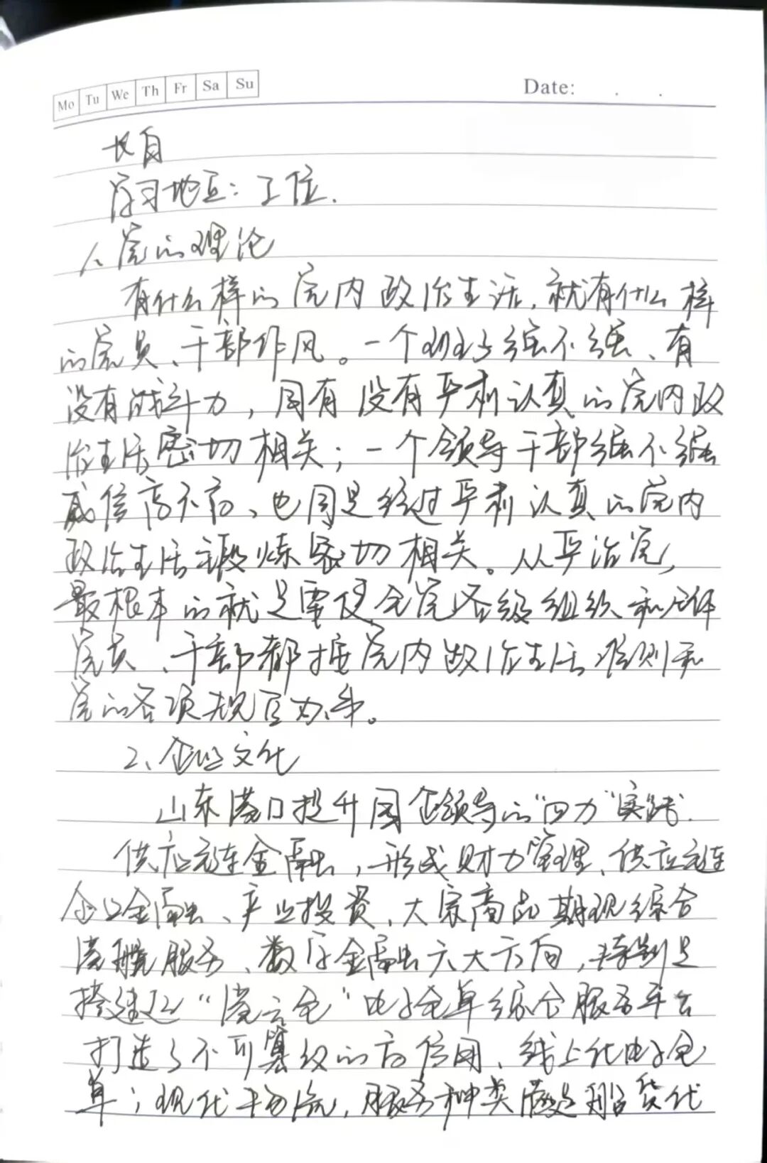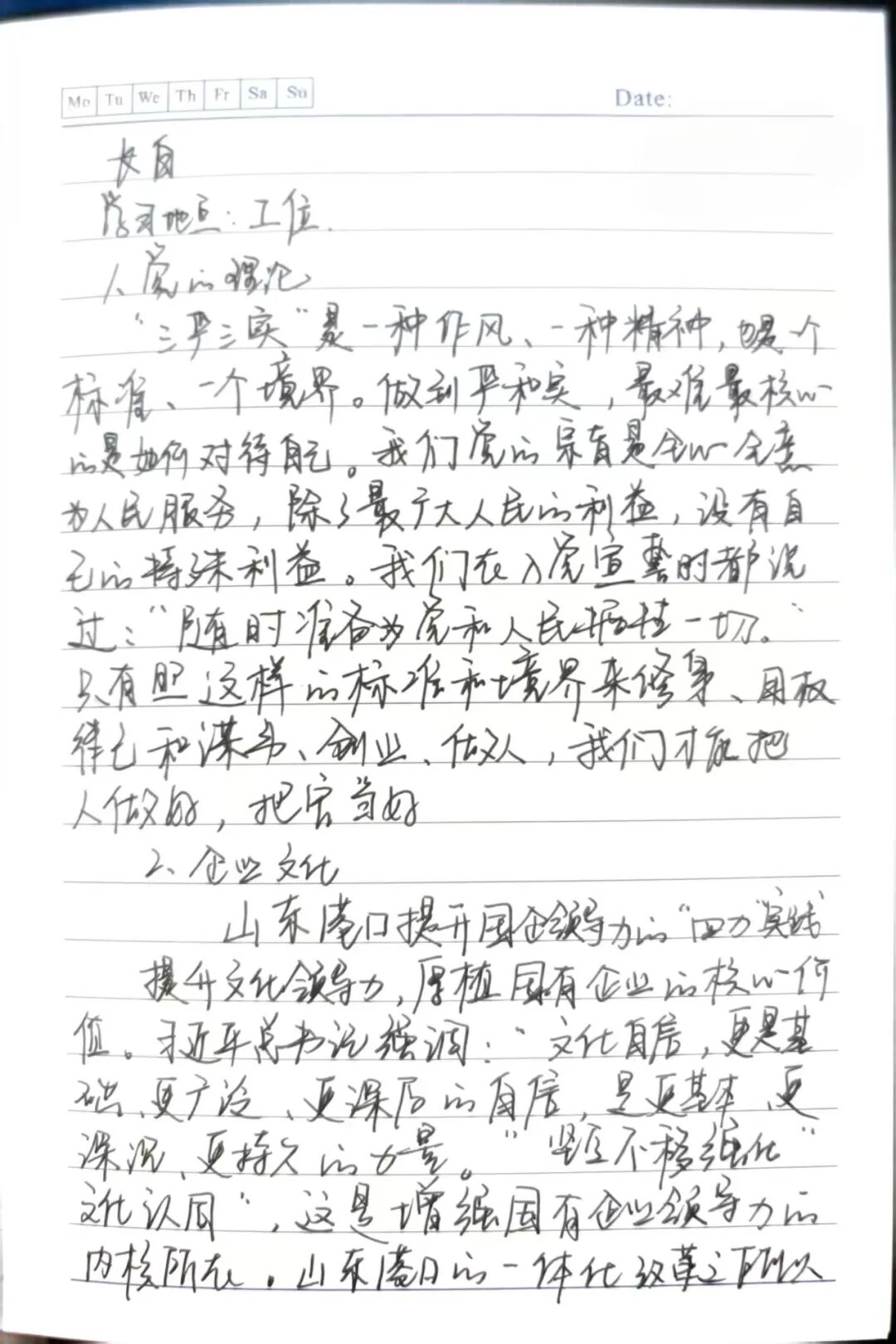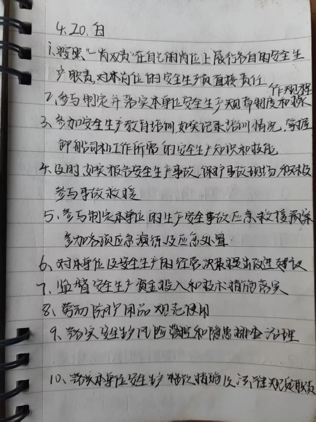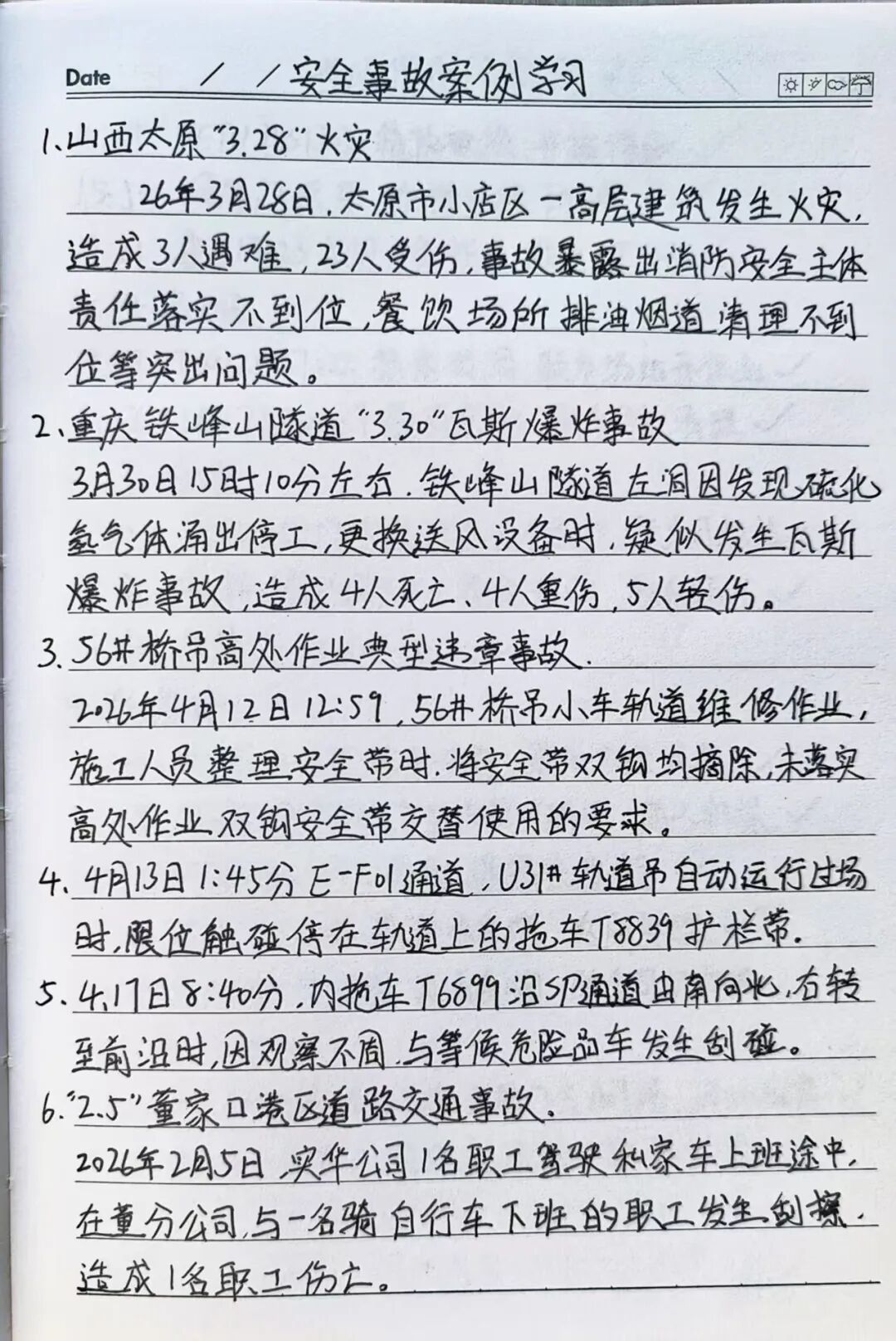 学习笔记是我八小时外的“岗位练兵场”。每天下班后,我都会在宿舍静下心来学习,把老师傅传授的设备常见故障处理要点,以及党的理论知识、企业文化内容、安全违章目录等,逐条认真记录在本子上。遇到重点、易错内容,便用横线着重标注,通过反复书写加深记忆,用最朴素的方式强化学习、巩固记忆,把岗位必备知识一点点记牢学透,让理论知识与安全操作要求真正入脑入心。