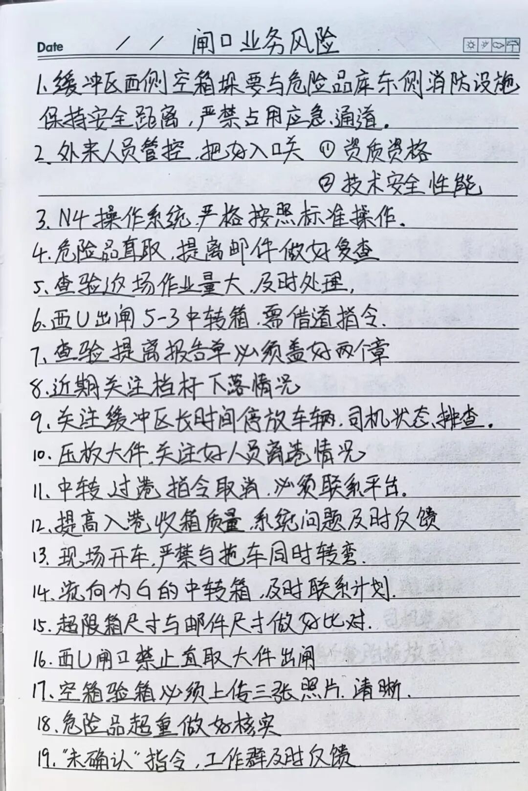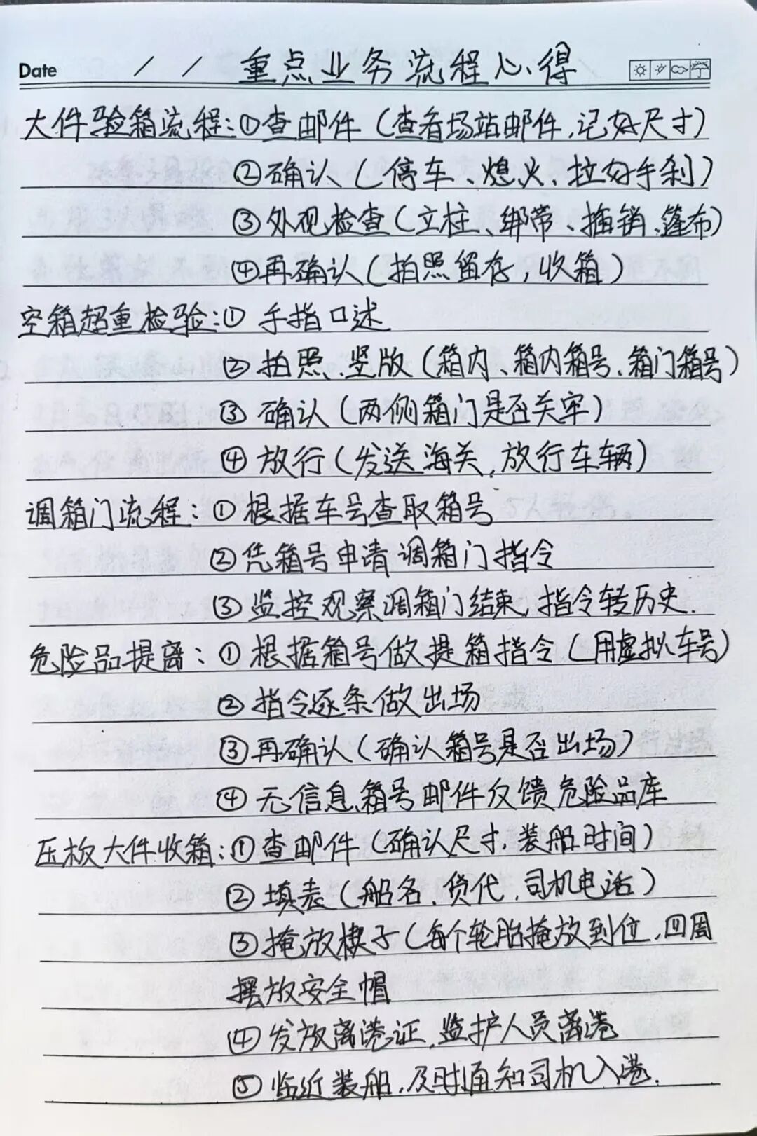 闸口是码头与场站之间的重要枢纽,作为一名闸口单证员,我业务涉及面非常广泛。记笔记,可以帮助我把配工会内容、操作要点、特殊情况、业务流程及时记录,并备注自己的作业心得,既能梳理工作思路,也能避免疏漏差错。记下来反复翻看,既是备忘录,也是成长积累册。