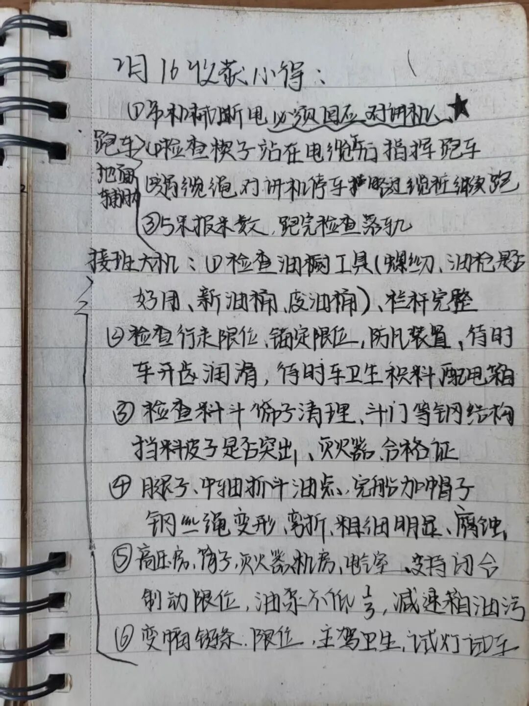 我的工作笔记坚持“实用至上、随记随用”原则,现场操作要点、注意事项、隐患排查细节都会第一时间记录。采用分类标注法,操作要点分条梳理,疑难问题单独标记并补充整改思路。字迹要工整清晰,页面简洁不杂乱,既记录标准规范,也整理老师傅传授的现场作业经验,把零散知识点系统化,让笔记真正成为自己岗位成长的“随身指南”。