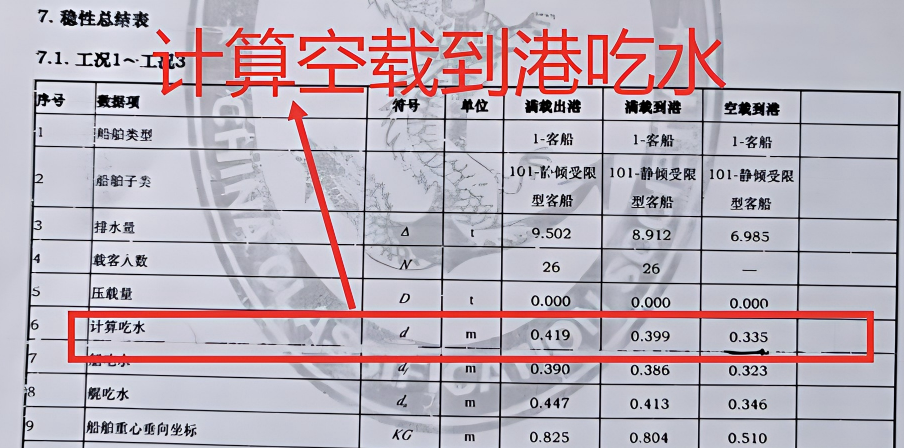 船舶空载到港工况实际吃水为0.24M,与稳性计算书计算吃水0.335M不一致。