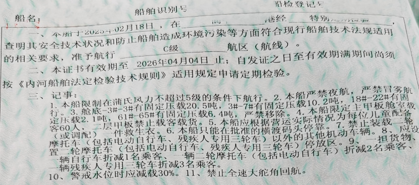 内河船舶安全与环保证书签注照片。温州海事局 母东标 摄