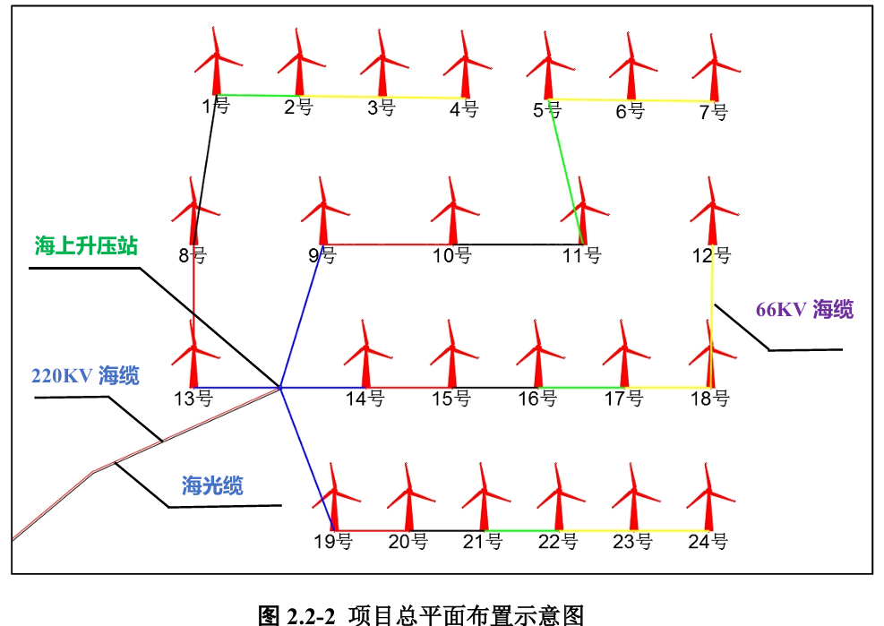 该工程总装机容量302.4MW,拟安装24台单机容量12.6MW的海上风电机组,配套新建一座220kV海上升压站。风电场所发电能汇集至海上升压站66kV母线,通过66kV海缆连接后接入220kV升压站,然后由220kV海缆送出至陆上集控中心。