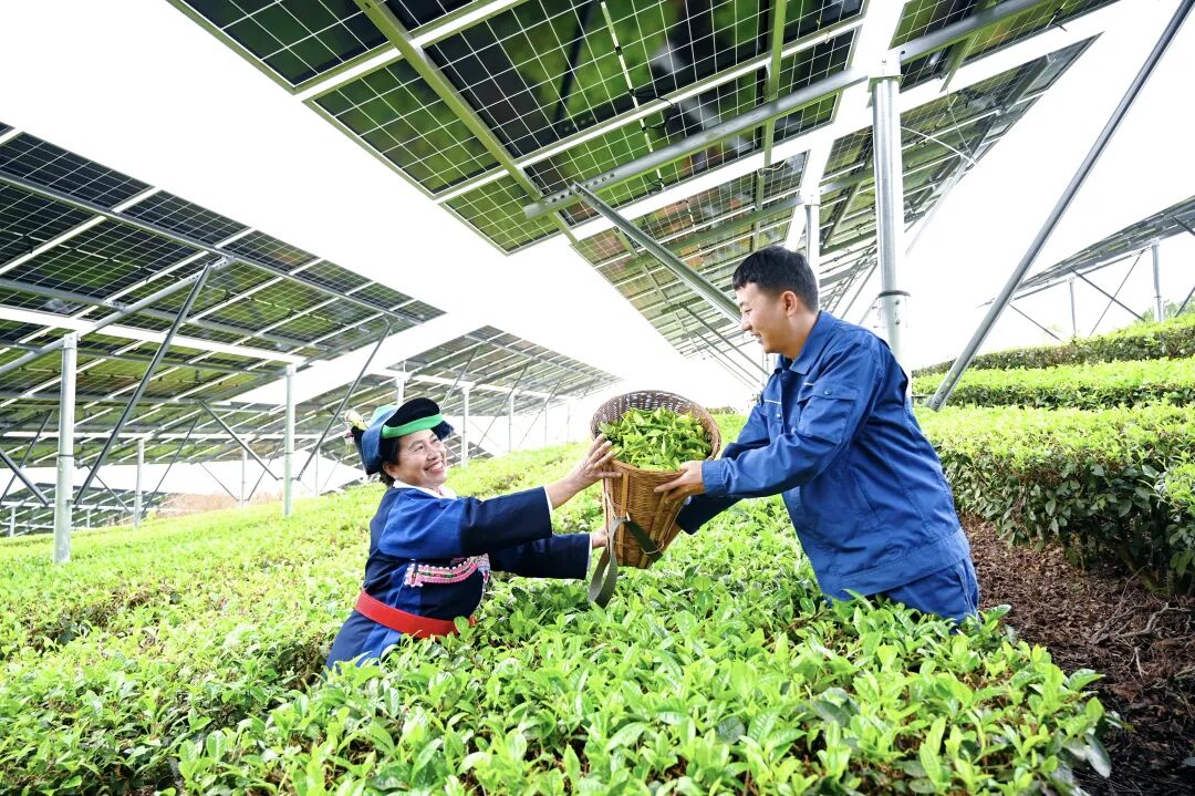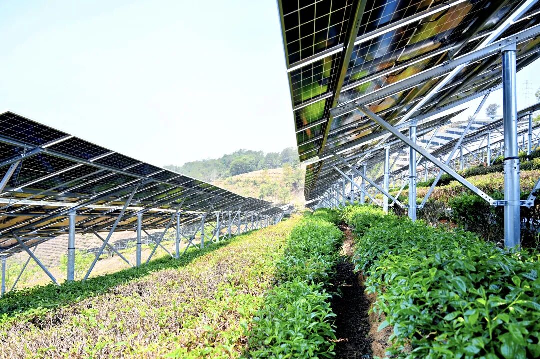 这里是中广核新能源龙坝光伏电站,“茶光互补”的产业融合在这里进行着。连片的光伏板不仅保护着娇嫩的茶树免受极端天气的冲击,还日常为茶树遮阴提质,成了茶园名副其实的“保护伞”。