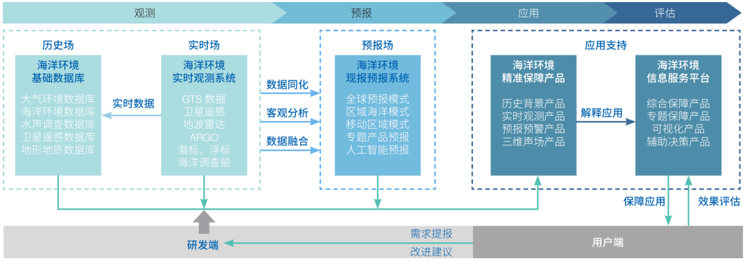在全链条精准保障技术体系的指导下,中国科学院组织开展了一系列科研攻坚和用户实践工作,取得的阶段性成果已经在用户端发挥重要作用。在全链条精准保障技术体系中,观测和预报技术是海洋环境保障的基础技术,确保提供覆盖保障空间和时间的历史背景(历史场)、实时态势(实时场)、变化趋势(预报场),保障用户能够全面掌握关注区域过去、现在和未来的海洋环境情况;应用技术是将基础海洋环境保障数据转化为用户使用产品的关键性工作,即将环境数据与用户实际需求结合起来,转化为其可直接应用的保障产品,其技术能力决定了海洋环境保障工作的实际效能;评估技术是对观测、预报和应用技术的检验评估,其评估结论不断由用户端反馈到研发端的各个技术环节,其不仅能够真实展现保障技术的能力水平,还是推进整体技术体系不断迭代完善的动力。“观测—预报—应用—评估”技术体系涵盖了海洋环境保障的主要关键技术节点,同时能够确保科研技术向用户端的高效转化,形成一套全面紧密闭环的技术体系。