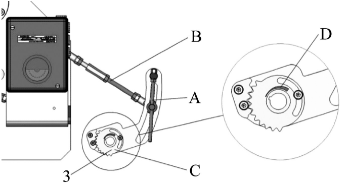 3—油量调节器;A—满负荷调节螺杆;B—小负荷调节螺杆;C—粗调齿轮;D—指示箭头