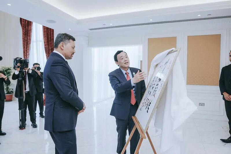 屈总干事向文莱苏丹哈桑纳尔讲解书法含义。©文莱王室
