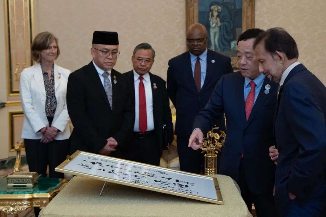 屈总干事向文莱苏丹哈桑纳尔赠送书法作品。©文莱王室