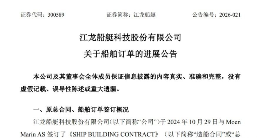 4月24日,江龙船艇科技股份有限公司发布公告称,该公司与Moen Marin AS签订2艘钢铝工作船,订单金额合计约9280万元,预计将于2027年12月30日交付。